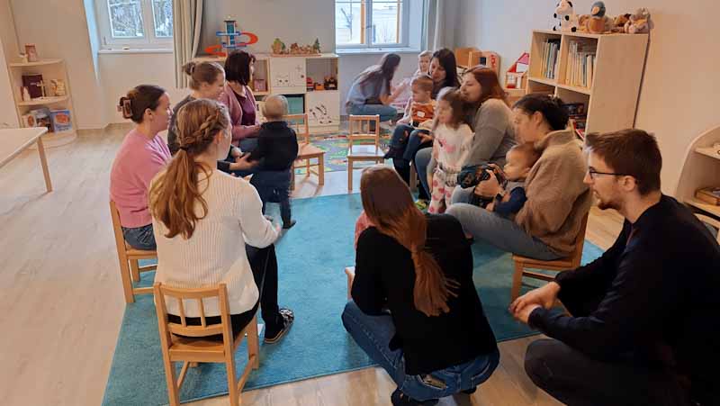 Érdeklődő szülők hozták gyermekeiket az óvodába ezen a szombaton. Három helyszínen foglalkoztattuk a gyermekeket, szülőket. A képen Nóri néni és Cili néni tartotta a baba ringatót a Liliom csoportban.